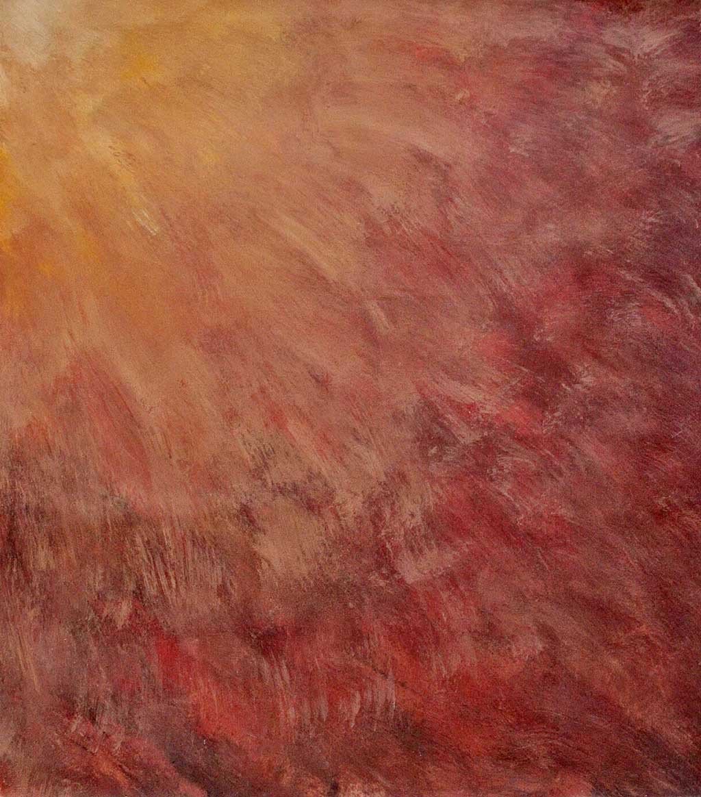 les registres coexistent selon les séries et les intentions. Sur toile de lin brut, bois ou papier, les couches se superposent, les matières s'accumulent, les surfaces gagnent en relief et en profondeur.