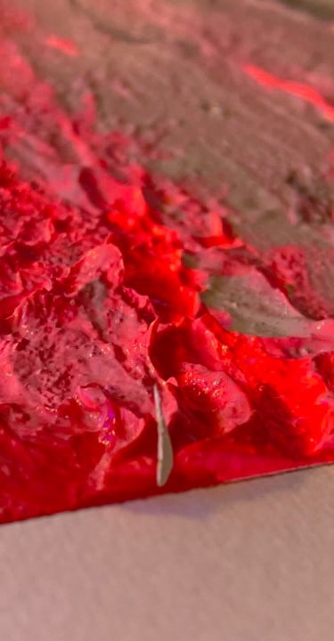 Gel médium, sable acrylique, enduits, pigments et peinture phosphorescente s'associent librement à l'huile et à l'acrylique. Certaines toiles révèlent une seconde lecture dans l'obscurité, d'autres portent la trace des outils qui les ont construites — couteau, spalter, doigts, rouleau.
