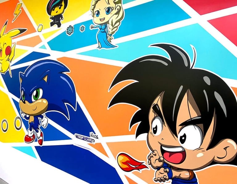 Habillages muraux conçus avec les enseignants, autour de thèmes choisis avec les élèves. L'occasion pour chacun d'expérimenter le travail collectif et quelques techniques de peinture murale.