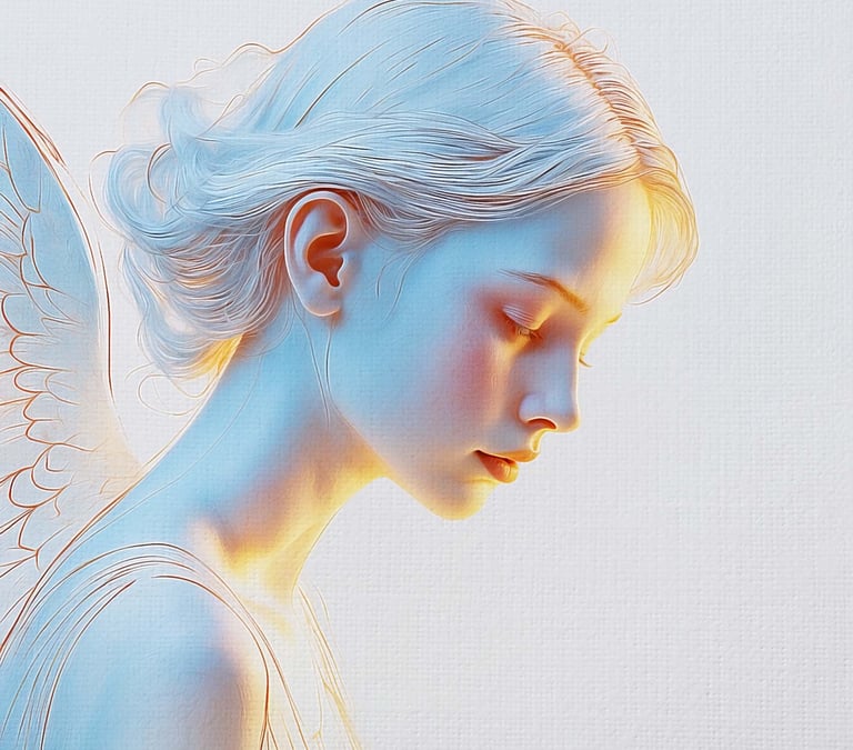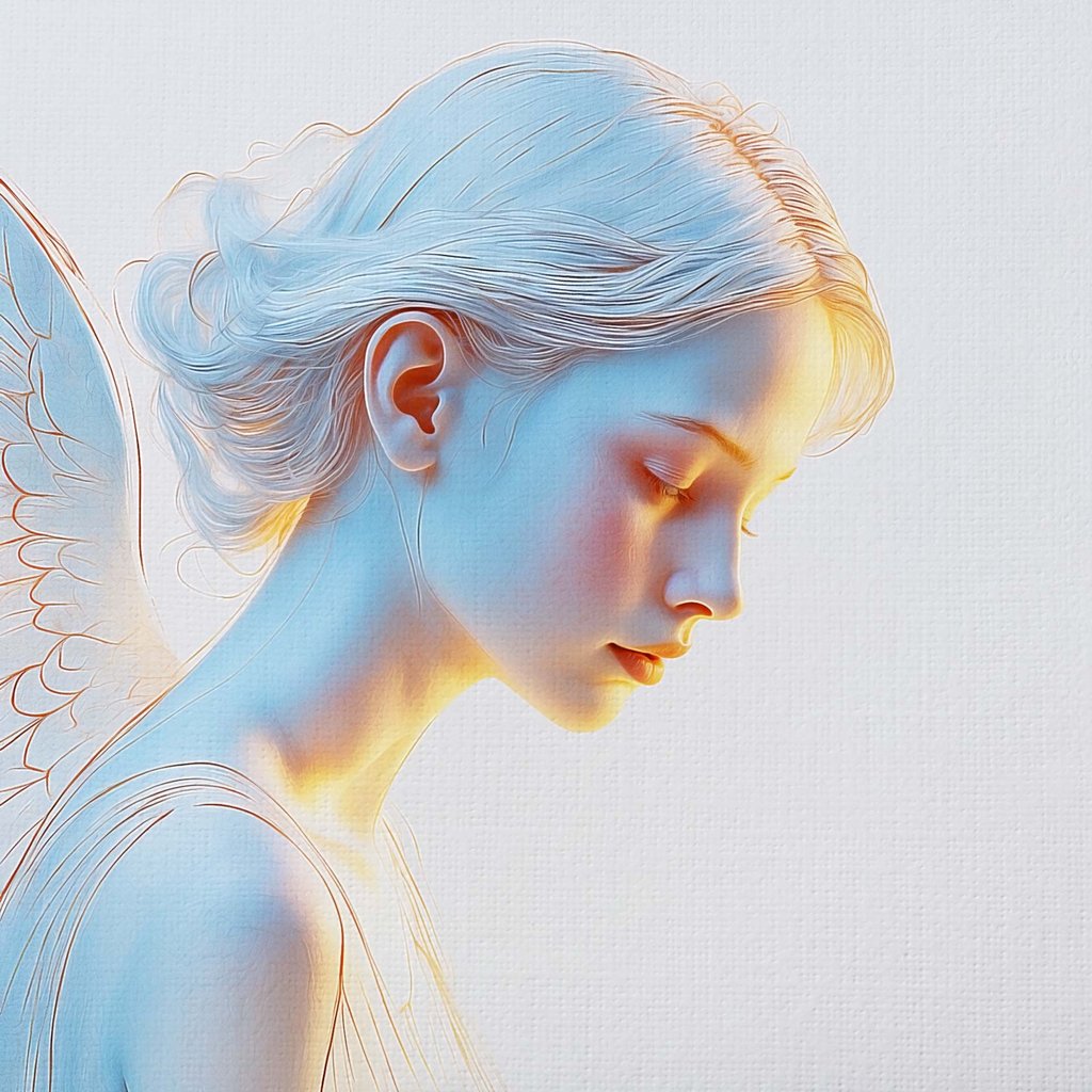Figures célestes et humaines aux contours adoucis ; une exploration de la présence, entre portrait classique et vision intérieure.