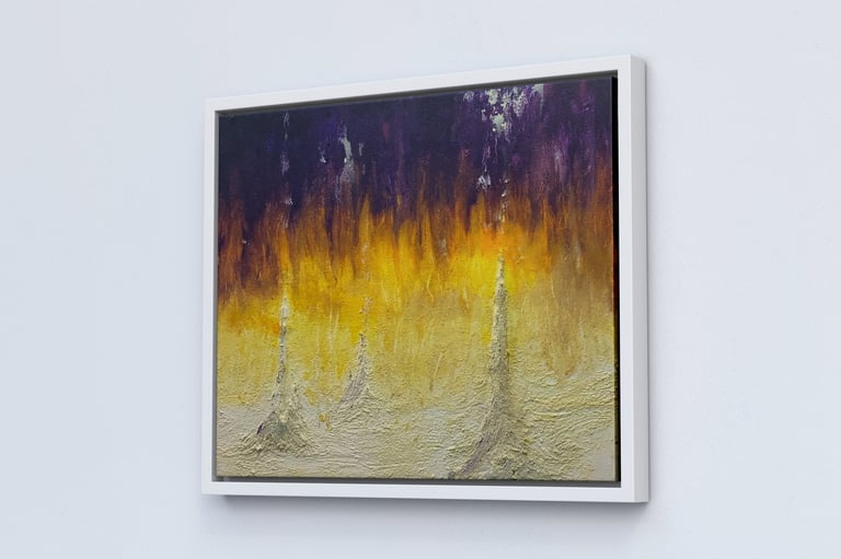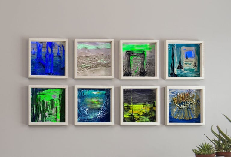 Compositions picturales nées d'une exploration par intelligence artificielle, retravaillées et intégrées dans une démarche plastique manuelle.